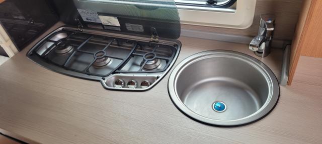 - groot keukenblok met driepits Dometic gasstel, spoelbak en ruime ladenkast